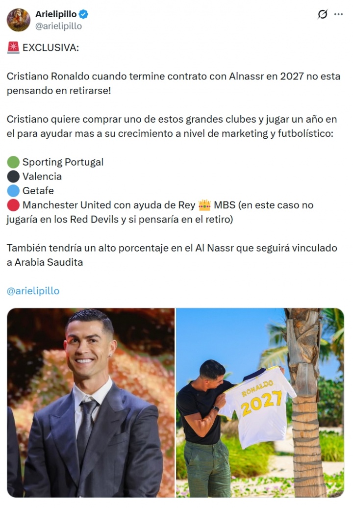 专注于报道C罗消息的网红博主Arielipillo爆料,他得到的独家消息称,C罗不会在2027年前退役。
